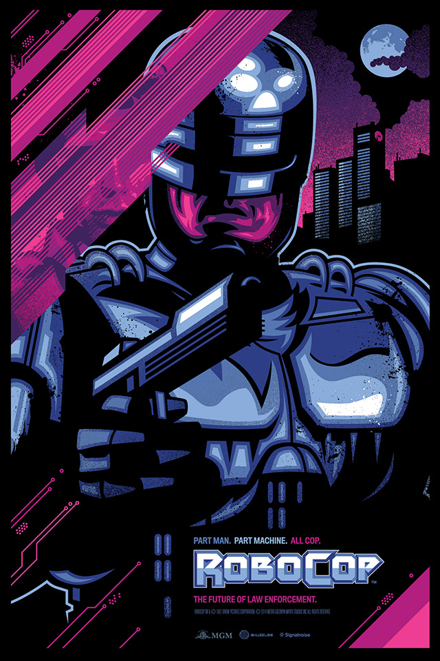 Official RoboCop movie poster, commissioned by Skuzzles Canada. This was a limited edition, 10-colour screen print with 3 metallic inks. Standing at 24" x 36", this poster was printed by the mighty D&L.